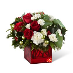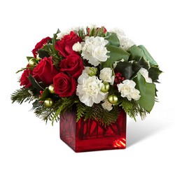 Blossoming with a Christmas charm that evokes memories of holiday seasons long past while nodding towards a sophisticated modern styling, this holiday flower arrangement is ready to spread the joy of the season to your recipient. Rich red roses and white carnations and mini carnations are artistically arranged amongst variegated holly and an assortment of fresh Christmas greens. Accented by matte green glass holiday balls and a sage green wired taffeta ribbon while seated in a red glass cubed vase, this stunning Christmas flower bouquet is ready to create a holiday memory your recipient will never forget. GOOD bouquet includes 5 stems. Approx. 8"H x 10"W. BETTER bouquet includes 9 stems. Approx. 9"H x 11"W. BEST bouquet includes 12 stems. Approx. 10"H x 12"W. EXQUISITE bouquet includes 17 stems. Approx. 11"H x 14"W.