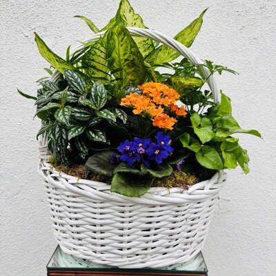 This large bold garden of an assortment of green plants, kalanchoe, and African violets blooming plants will make your loved one smile. 13.5"x11"x15"