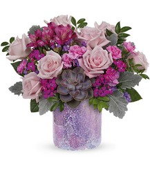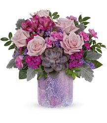 As magical as sunset in the desert. Luscious pink roses and a sculptural succulent get the glamorous treatment in a shimmering mosaic glass vase. *ARRANGEMENT IS A SMALL TO MEDIUM SIZE*