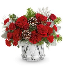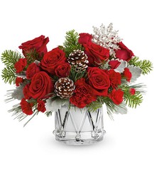 The March of Joy Bouquet brings festive cheer with vibrant red blooms and frosted greenery, all arranged in a keepsake Crystal Drum Vase. A joyful addition to any holiday celebration. *Keepsake Vase/ Considered a small arrangement*
