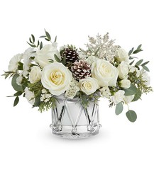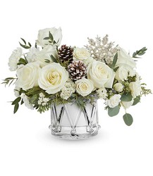 The Sparkling Wishes Bouquet is a winter wonderland of white blooms, fresh greenery, and frosted pinecones. Arranged in a keepsake Crystal Drum Vase, it's a stunning gift for the holidays or New Year.*Keepsake Vase / Considered a small Vase arrangement*