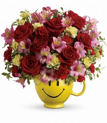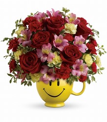 Send smiles across the miles with this magnificent mug of blooms! Sure to become their favorite for morning coffee, this sweet ceramic design brims with lush red roses, pink alstroemeria and miniature red and yellow carnations. It's a great way to send your love! *ARRANGEMENT IS SMALL TO MEDIUM SIZE* Approx. 12 1/2 W x 12 H