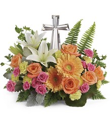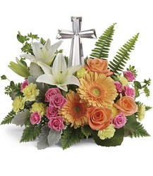 Nestled among bright orange gerberas, pink roses and white lilies, this precious crystal cross keepsake brings joyful reverence to your special occasion.
