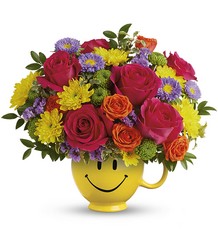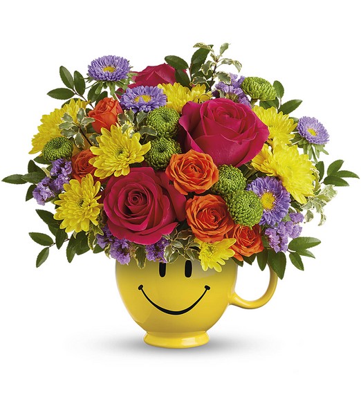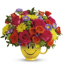 Happiness, delivered! Colorful roses in a cheerful ceramic mug are the quickest way to turn any day into a GREAT day. *ARRANGEMENT IS A SMALL TO MEDIUM SIZE*
