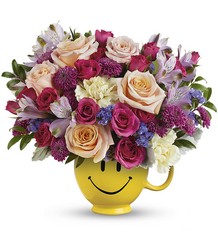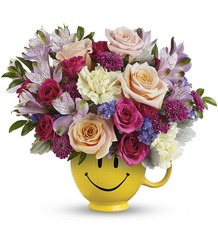 Send a cuppa cheer with this happy surprise of colorful roses and blooms in a smiling ceramic mug they can sip from for years to come.*ARRANGEMENT IS SMALL TO MEDIUM SIZE*