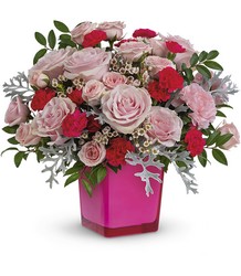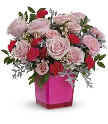 Pink power! Pretty up any occasion with this fabulously feminine bouquet of pink roses in a hot pink glass cube that lives on as the perfect votive candleholder. *ARRANGEMENT IS A SMALL TO MEDIUM SIZE*