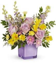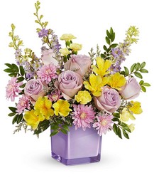 Bring a soft touch of spring indoors with the Pastel Paradise Bouquet. Lavender roses and golden blooms shine in a radiant purple glass cube, creating a fresh, joyful display of color and beauty. *ARRANGEMNET IS A SMALL TO MEDIUM SIZE*