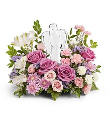 Bring peace and comfort with the In Heaven's Arms Bouquet, featuring soothing lavender roses and soft pink blooms surrounding a luminous crystal angel keepsake-an elegant symbol of love's everlasting light.