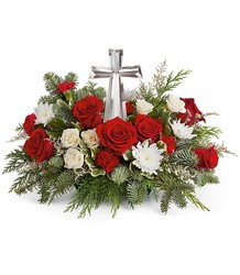 The crystal cross is nestled elegantly among red and white blooms, this keepsake brings joy and light to your special occasion.