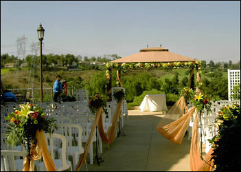 Chocolate, Kermit Green and Ivory colors create a beautiful setting. Garlands on the canopy flowers down the aisle are finished with a swag of material.