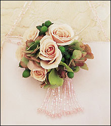 Subtle tones of pale pink and green, accompanied by a handful of glossy green berries, to match the tone of any wedding member's purse.